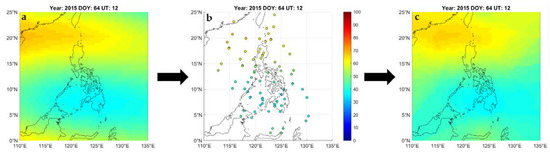 (a) A GIM map is taken from the IONEX file. (b) VTEC values from different points of the GIM map were taken. The points were chosen from the varying number of chosen GNSS stations based on Figure 3. (c) The map is recreated using kriging based on (b).