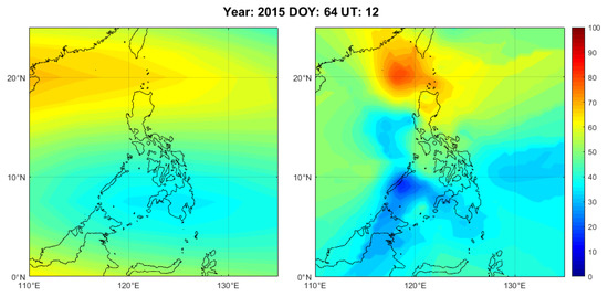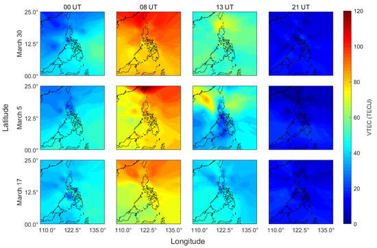 This method of studying the VTEC around the Philippines is exactly the method that Mendoza [21] used. A constraint is that only VTEC at specific points can be observed. Although the latitudinal distribution was considered, the longitude was not. He also mentioned how the GIM-based method for calculating VTEC introduces potential errors due to the lower spatial resolution of GIMs. The transition from one dimension to two dimensions may just provide more context surrounding the VTEC in the region.