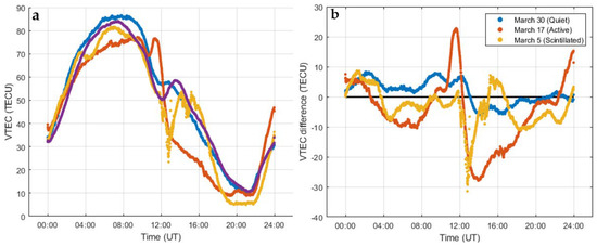 The differences across all three dates did not exceed ±30 TECU. The differences between 30 March and the average were consistent and did not exceed ±10 TECU. During the first part of 30 March, VTEC was higher than average, while, during the latter part, it was lower. On 5 March, VTEC was lower than average for most of the day. The noisy dip was once again observed after 12 UT. VTEC was higher than average on 16 UT. On 17 March, the VTEC started higher then decreased into negative values and started higher again by 8 UT. At 12 UT, a sharp increase in difference occurred, which became higher than average. Then, it went back to the negatives. The difference slowly increased again. By around 22 UT, the VTEC differences went back to positives. Compared to quiet days, active and scintillated days significantly differed to them at around 13 UT as the differences exceeded more than 10 TECU.