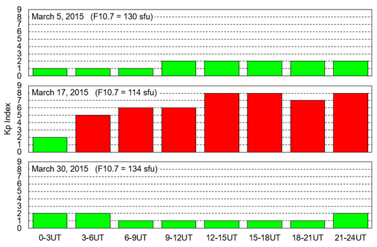 The storm that occurred on 17 March, also known as the St. Patrick’s Day storm, was a negative storm due to the observed depletion in VTEC. The depletion on this date could be caused by perturbations of neutral gases in the ionosphere. The density of neutral O2 and N2 increases while atomic oxygen density decreases. This causes the ionosphere to be composed of more neutrals than ions, hence a depletion of TEC [21]. It has also been confirmed that O/N2 decreased in Asian sectors the day after the storm [38]. This storm was caused by a coronal mass ejection (CME) from the Sun that occurred on March 15. It reached Earth on St. Patrick’s Day, 17 March, creating the strongest geomagnetic storm of Solar Cycle 24 [38,39].