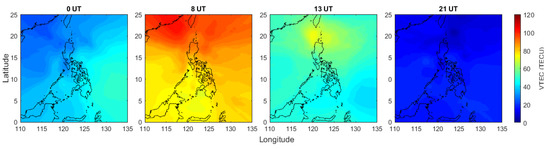 First, two-dimensional maps were produced for the average quiet day VTEC at the selected times illustrated in Figure 9. On an average quiet day, the VTEC starts higher around the eastern region than in the west, with VTEC almost reaching 60 TECU at 0 UT. At 8 UT, a north–south VTEC gradient was observed. The southern side had a VTEC of around 70 TECU, while the north had around 80–90 TECU. At 13 UT, the gradient was still maintained, albeit lower than what was observed at 8 UT. The VTEC level at 21 UT was generally below 10 TECU. What is shown in the 2d maps lines up mostly with Figure 7, considering it is only a 1d map.