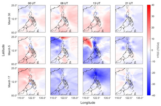 Further, 13 UT is where all three days greatly differ. The north–south gradient is preserved on 5 March and 30 but completely absent on 17 March. The TECU levels on 30 March were higher than the other days, with a VTEC of about 60 TECU, and the north side reaching as far as around 80 TECU. The gradient on 5 March is much greater than that of the quiet day. An area of depleted TEC of only around 20 TECU running vertically from north to south is observed on this date. A zone of higher VTEC is present around the northwest, with a peak of around 80 TECU. At 21 UT, all three days appear to be similar again, with low VTEC spots once again observed by PURD. The VTEC during this time is around 10 TECU for all three dates. To show how the maps in this figure deviate from the average day, Figure 9 was subtracted to Figure 10 on each day, creating Figure 11. The blue zones indicate a lower VTEC than average, red higher and white neutral.