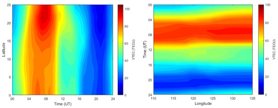 With the use of the optimum parameters, the mapping method was applied to the actual GNSS TEC data over the Philippines during different space weather conditions, and the results were analyzed. The spatial resolution of these maps was 0.5° × 0.5° in latitude and longitude. The temporal resolution was 1 h. TEC maps only showed the spatial trend of the ionosphere. A time series of maps was developed using data recorded every two hours, totaling 12 maps in an observation day. The range of the map is 110° to 135° in longitude and 0° to 25 in latitude. This area corresponds to the Philippine region and parts of its surrounding countries. Contour plots that show the spatiotemporal variation in the maps in terms of latitude and longitude were also produced. This was completed by creating a VTEC map with a time resolution of 1 h. The average VTEC was taken across all longitudes within each latitude. The average VTEC was taken across all longitudes within each latitude and vice versa.