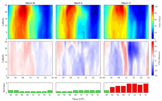 Latitude profiles of 30 March, 5 March and 17 March with the difference between them and the latitude profiles of quiet day VTEC plus Kp-index bar graph.