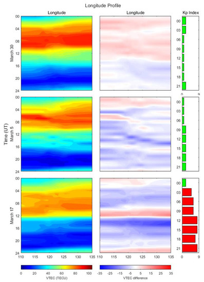 Looking at Figure 14, there was not much longitudinal variation on 30 March. Temporally, the VTEC variation was consistent with the latitude profile. The VTEC during the day reached beyond 80 TECU. Its difference was similar to what was observed in the latitude profile, with VTEC going above average during the day and below average during the night. The difference values only ranged around ±10 TECU. The peak VTEC times on 5 March did not last as long as the other days. The differences with the average showed a higher start but started to lower somewhere around 8 UT. There also seemed to be an area of very low VTEC of around −30 TECU difference after 12 UT and moved due east as time progressed. The peak VTEC on 17 March was not as high as the other dates. This peak was generally around 70–80 TECU. This reflects the depletion in electron density, as mentioned previously. The increase and sudden drop at around 12 UT can also be observed here, just as in the latitude profile.