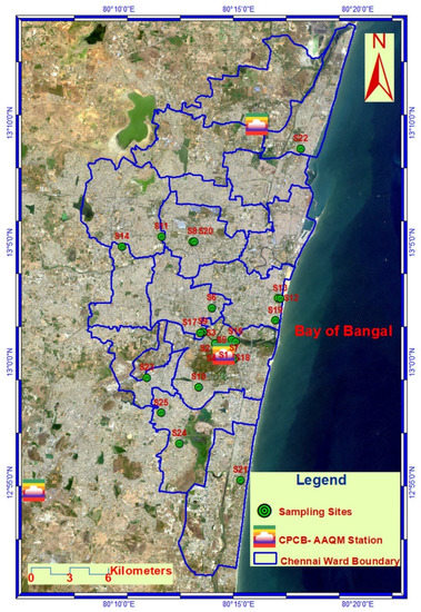 The Chennai megacity is the fourth largest city in India and the capital of Tamil Nadu state. The study area is approximately 70 square miles and falls within the latitudinal and longitudinal extensions of 12°50′–13°20′ N and 80°10′–80°40′ E, with a mean sea level of 6.7 m (Figure 1). The Chennai metropolis experiences a tropical climate; thus, the weather is typically hot and humid. The study areas fall in three different geological formations: the Archaean crystalline rocks, consolidated Gondwana formation, and Tertiary periods of sediments. Additionally, it presents in the recent alluvium formation. The northern part is primarily an industrial area, comprising petrochemical industries at Manali (Chennai Petrochemical Corporation Limited or CPCL), thermal power plants at Ennore, and other industries at Ambattur. The southern part of Chennai has industrial regions (Guindy Industrial Estate), while the western section, near Sriperumbudur on the Bangalore highway, is growing with new factories. A part of logistics, software services, health care, automobile, and manufacturing industries form the financial base of Chennai city.