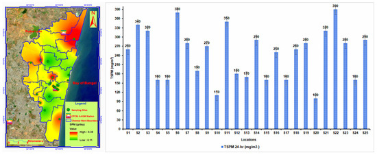where q is the quality rate of air pollutants, V is the observed value of the parameter, and Vs is the standard value recommended for the parameter. The SPM rating scale, ambient air quality index description, TSPM (µg/m3) for 24 h, and AQI of the study area are reported in Supplementary Materials Table S1. The study area has maximum AQI at the sampling sites S22 and S6 and minimum AQI values at S10 and S20. Based on The Indian National Ambient Air Quality Standards (INAAQS) for SPM, the indoor particulate of the study area falls under the moderately polluted category. The main source of particulate matter in the indoor environment an outdoor particulate matter by the invasion of fine particles through cross ventilation, cooking, smoking, and other indoor activities [8].