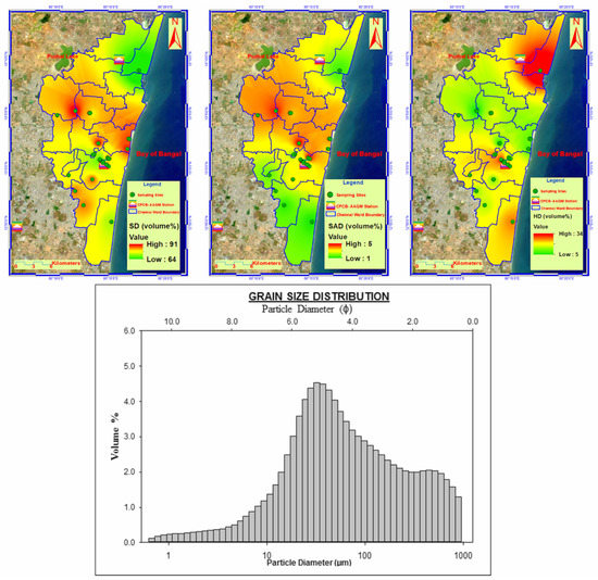 The particle size of the collected AC filter samples plays a major role in the indoor environment. The particulate matter was classified as suspended atmospheric dust (SAD), heavy dust (HD), and settled dust (SD) based on their size. The measured particle size of the samples ranges from 0.5 μm to 1000 μm. The particulate matter with a size range of 0.001 µm to 1 µm is mainly suspended atmospheric dust, 1 µm to 100 µm is accumulated settling dust, and 100 µm to 1000 µm is heavy dust [36]. The spatial variation of the settled and suspended atmospheric particulate, heavy particulate, and overall particle size distribution of the study area is given in Figure 4.