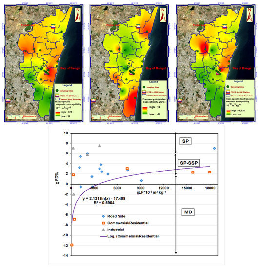 Likewise, the particulate samples with very low χfd (<0.03%) are probably derived from a pedogenic origin, and this observation suggests that the surrounding soils do not contribute magnetic minerals to the particulate matter [32,36]. Figure 5 represents the source and magnetic characteristics of the grains in the particulate samples as SP—super paramagnetic grain, MD—frequency-independent coarse multidomain, and SP-SSD—superparamagnetic stable single domain [38]. According to [35,37], the magnetic susceptibility and frequency-dependent susceptibility (χfd) were in low positive correlation. It indicates that the coarse particulate grains are primarily derived from anthropogenic (industrial) activities (Figure 5).