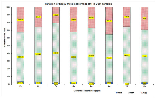 The essential metal concentration in every sampling site was examined. The mean grouping of components in ppm is 24,790.2 for Fe, 801.2 for Cr, 100.25 for Pb, 191.17 for Cu, 865.44 for Zn, 410.2 for Mn, 436.3 for Ni, and 6.6 for Co. Particulate particles from traffic and industrial emission zones in urban environments are the main source of toxic elements such as Cd, Cu, Zn, Ni, and Pb, etc. [12]. Similarly, the minimum and maximum concentration of toxic metals in ppm are Fe (2583 to 48,636), Cr (97 to 2235), Pb (8.8 to 373), Cu (15.5 to 385.6), Zn (43 to 2270), Mn (37 to 709.7), Ni (1.5 to 1289.7), and Co—(0.48 to 15.4), which are shown in Figure 6.