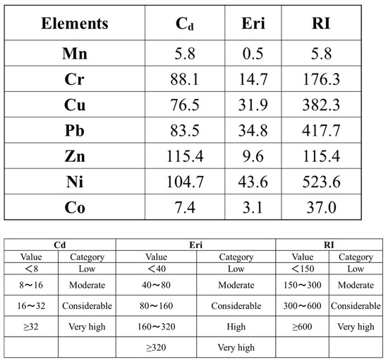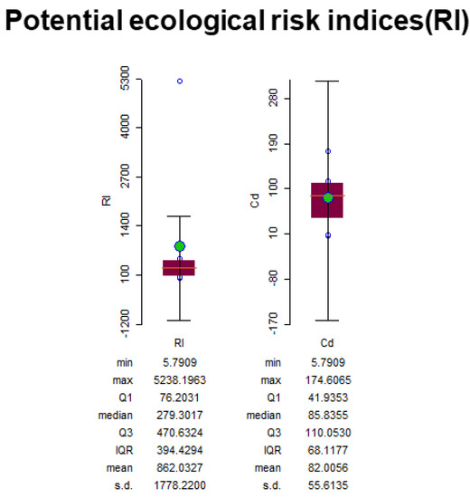 where Ci is the concentration of determined metals in the particulate samples, Cn is the background concentration of metal, Cri is the pollution factor of individual metals, Cd is the degree of contamination, and Eri is the potential ecological risk of individual metals; Tr represents the toxic values of each metal, which were estimated as Cu = Pb = Ni = 5, Zn = 1, Cr = 2, and Zn = 1. RI is the risk index of multiple elements. The classifications of heavy metal pollution and pollution indices were given in Figure 7. The result of pollution indices explains the standard factor at different levels. It is then calculated based on the single element pollution factors, degree of contamination, and comprehensive potential ecological index, as presented in Figure 7. The box whisker plot shows the potential ecological risk of individual metals, which shows that Ni is significantly enriched, followed by Pb, Cu, Cr, Zn, Co, and Mn. However, the potential ecological risk of multiple elements indicates that the metals were under a substantial range of 300 to 600. The contamination degree of heavy metals and risk index (RI) of the trace elements were in the following order: Ni > Pb > Cu >Cr > Zn > Co > Mn.