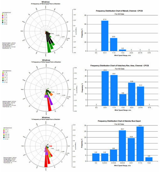 The wind rose and frequency distribution chart of the Manali-Industrial area, Velachery-Residential area, and Alandur Bus Depot-Traffic/Roadside area in Chennai metropolis.
