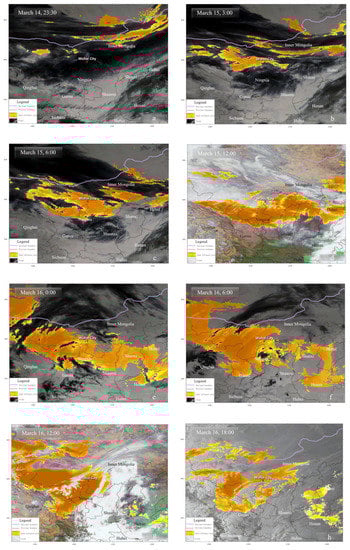 Sandstorm transport process based on remote sensing observations: (a,b) sandstorm occurred; (c–n) sandstorm continued; (o,p) sandstorm dissipation.