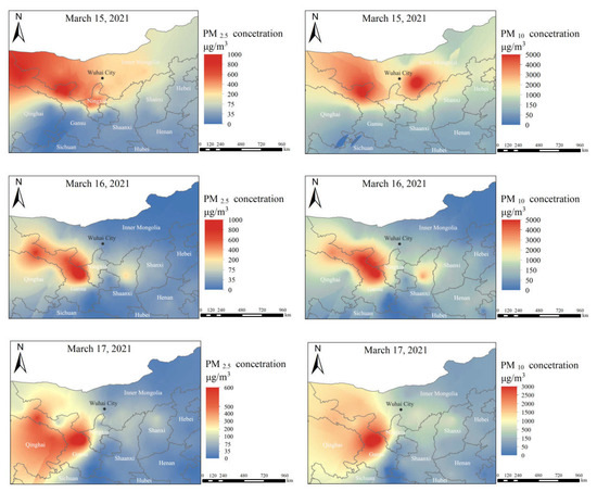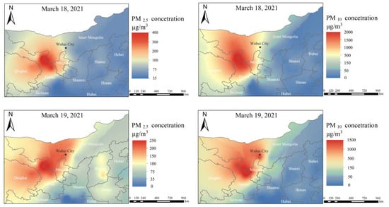 Spatial distribution of PM2.5 and PM10 concentrations during the sandstorm.