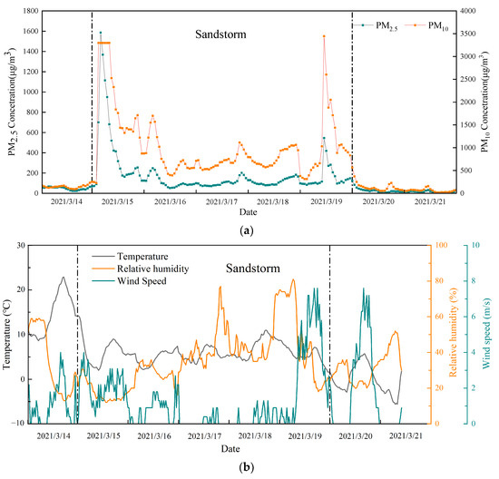 (a) Daily change of PM2.5 and PM10 concentrations in Wuhai during the sandstorm; (b) changes of meteorological conditions in Wuhai during the sandstorm.