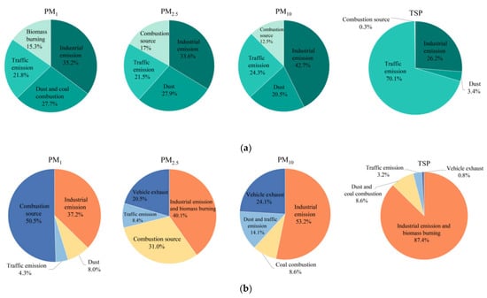 Source apportionment of PM1, PM2.5, PM10 and TSP during the (a) non-sandstorm and (b) sandstorm.