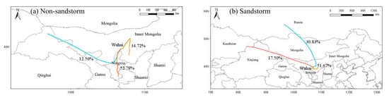 To further investigate the airflow transport characteristics in Wuhai during non-sandstorm and sandstorm days, 72-h backward airflow trajectories arriving at Wuhai were clustered and analyzed using MeteoInfo software (Figure 5). The results showed that two clusters during non-sandstorm periods were dominated by short-distance transport, from southern Ningxia (52.78%) and south-central Inner Mongolia (34.72%). Another cluster (12.50%) came from northern Gansu, passing through the southwest edge of Inner Mongolia to reach Wuhai with long-distance transport. However, two clusters were dominated by long-distance transport and were characterized by rapidly moving speeds during the sandstorm. One of the clusters (30.83%) came from the south of Russia and reached Wuhai via central Mongolia and northern Inner Mongolia. Another cluster (17.50%) came from the northern border of Xinjiang, passing through north and central Xinjiang in a northwesterly direction, crossing a small part of southwestern Mongolia and northwestern Inner Mongolia to reach Wuhai. The highest percentage (51.67%) of the cluster from south-central Inner Mongolia was dominated by short-distance transport, and the cluster moved slowly, passing through Ertokqi and Hainan district of Wuhai city.