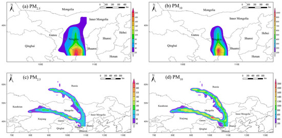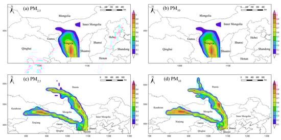 Compared to the PSCF method, the CWT method is more intuitive to identify potential source areas with high concentration contributions (Figure 7). The results showed that the high CWT areas of PM2.5 and PM10 (>120 μg·m−3, 600 μg·m−3, respectively) during non-sandstorm days were mainly in southern Ningxia, southeast Gansu and western Shaanxi. The concentration contribution values of particulate matter during sandstorm days were all much higher. The high CWT area (>240 μg·m−3) of PM2.5 was mainly in northwestern Inner Mongolia. The contributions of southern Russia, northern and southwestern Mongolia, and northern Xinjiang to the PM2.5 mass concentration in Wuhai were also in the range of 160–240 μg·m−3. All regions contributed more than 200 μg·m−3 to the PM10 concentration. Among them, the contribution of northwestern Inner Mongolia was as high as 1800 μg·m−3. The contribution to PM10 mass concentrations of southern and southwestern Russia, northern Mongolia and parts of northern Inner Mongolia also ranged from 1200–1800 μg·m−3.