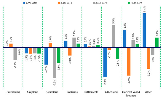 The observed decrease in GHG removals, with an annual average rate of 2.64% per year in the 2012–2019 time period, attenuated the increased trends manifested during the intervals 1990–2005 (1.29%/year) and 2005–2012 (0.1%/year), with an average annual increased rate of 0.04% for the three decades 1990–2019 (Figure S4, Supplementary Materials). The decreasing trends of GHG emissions recorded during the three time periods highlighted determined a decrease of 1.06%/year for the whole analyzed time period. Forest land and HWP make the largest contribution to the GHG net removals budget, Table 2.