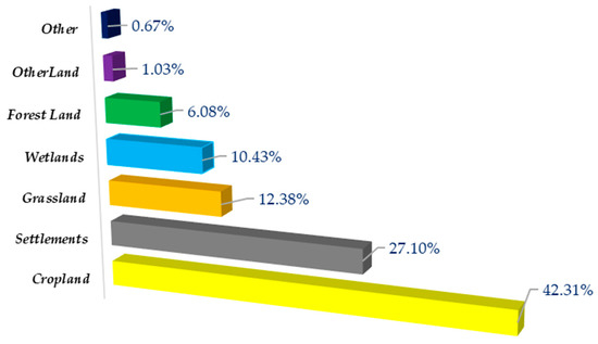 In Romania, agricultural activities, mainly from land management and land use change in cultivated land, are identified as one of the main producers of greenhouse gases (GHGs) from LULUCF, namely methane (CH4), nitrous oxide (N2O) and carbon dioxide (CO2), accounting for more than 40% of GHG emissions (Figure 4). That is why the intelligent management practices of cultivated lands, among which we mention the replacement of synthetic nitrogen with organic fertilizer, the use of crops with a high capacity to fix nitrogen in the soil, and encouraging organic farming, could be measures to reduce GHG emissions.
