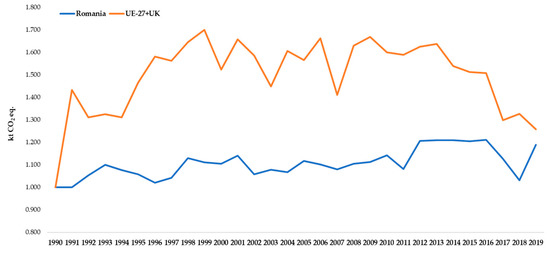 Net GHG removals dynamics comparative aspects, UK-27 + UK vs. Romania (1990 = 1).