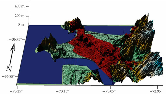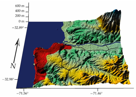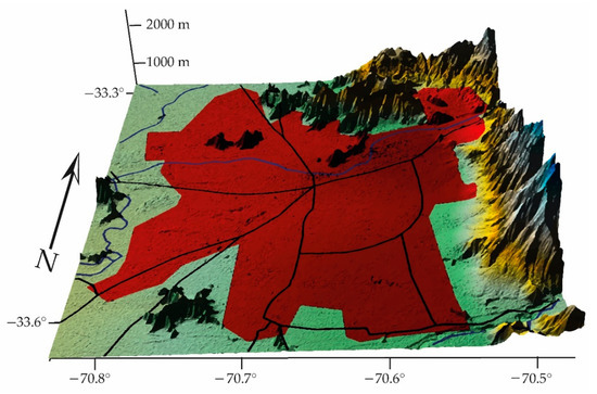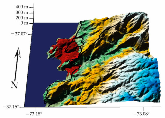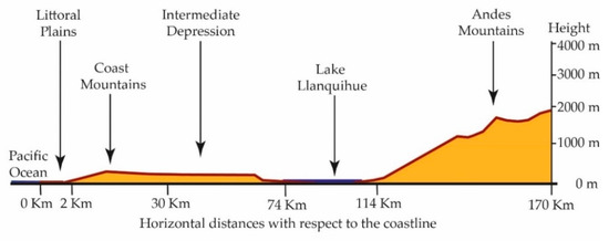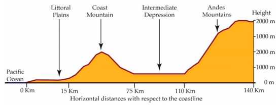 It studies the shapes of the earth’s surface in order to describe and understand its genesis and its current behavior [12]. This article focuses on cities that may be located in a basin (a basin is a depression in the earth’s surface, a valley surrounded by heights) with a confined wind regime. It also focuses on those located in coastal areas, which are commonly defined as the zones of interaction or transition between land and sea, including large continental lakes. Coastal zones are diverse in dynamics, function and form and are difficult to define according to strict spatial criteria. Finally, it explores human settlements in high mountain areas with good ventilation. Figure 1, Figure 2 and Figure 3 show the types of geography profiles present in Chile:
