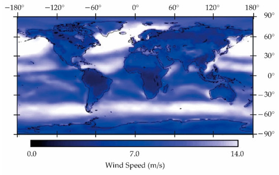 Annual wind speed at 10 m for airport-like terrain. July 1983–June 1993. (Public archive, NASA/SSE, 13 September 2004). The figure shows the zone of equatorial calms and, to the south, the belt of strong subantarctic katabatic winds.