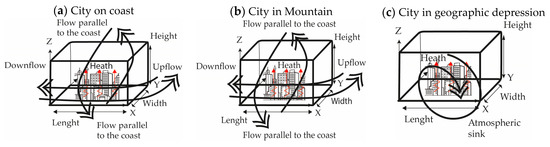 If we consider the natural dynamics of Valley–Mountain breezes, solar radiation arrives nonuniformly on the slopes of mountains and valleys. In addition, the radiation changes its angle of incidence according to the time of day due to the apparent movement of the sun. The thermal flow of air generated is restricted by the centers of high and low pressure induced by the differences in daily temperatures produced between the valley and the mountains [13]. On the other hand, there is an unequal thermal behavior of water and land [14].
