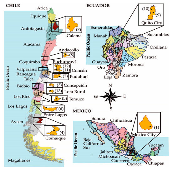 A map shows the monitoring stations (black asterisk *) of Chile, Mexico City and Quito in Ecuador used in this study (Figure 7). Table 2 indicates the characteristics of the climate, geography, type of pollutants and meteorology: