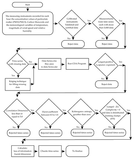 The flowchart describes the process that verifies the chaoticity of each series. The analysis is repeated for the six variables measured in each of the thirteen locations, giving a total of 78 time series.