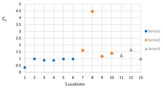 Determination of CK = SK, MET.VAR./SK, POLLUT defined as the quotient between the sum of the entropies of pollutants with the sum of the entropies of the meteorological variables, values extracted from Table 4, for each locality.
