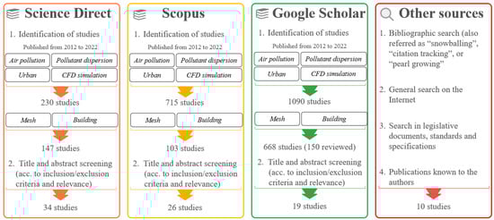The search was performed in such a way that all the keywords were present in the full-text or metadata of the papers. Furthermore, a search filter was applied, limiting the publications to those published in the last ten years (2012–2022). Due to the large number of papers that were obtained, two more search terms were added to additionally focus the search on papers concerning only urban CFD applications, as follows:
