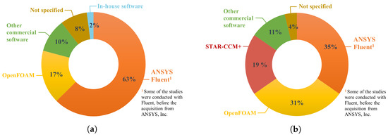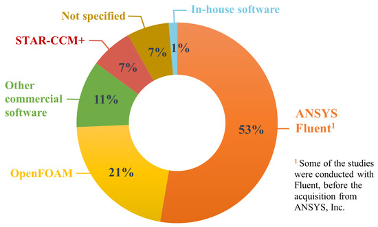The authors believe that the choice of suitable computational fluid dynamics software would be of interest to the researchers and engineers working in the field. An overview of the software packages used in the reviewed publications is presented in Figure 5. It should be noted, however, that such a breakdown is not necessarily an objective representation of the capabilities or deficiencies of different tools. There may be non-technical reasons behind the choice of a particular computing environment, such as availability, resource limitations and user base loyalty, which are beyond the scope of this work.
