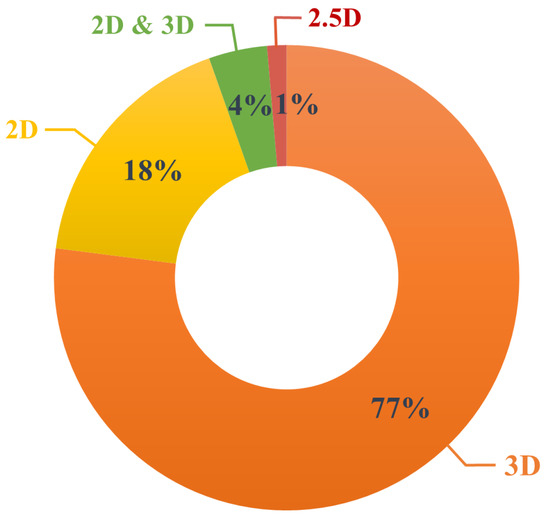 The distribution between the different dimensionalities used in the reviewed papers is presented in Figure 7. The majority of authors, 77%, use 3D models in their analyses, 18% use 2D models, and the remaining 5% utilize either 2.5D, or both 2D and 3D models. One of the publications [45] presents an overview of the experimental and modelling studies published in the last two decades and states that previous studies show significant differences in the airflow and dispersion between 3D and 2D canyons.