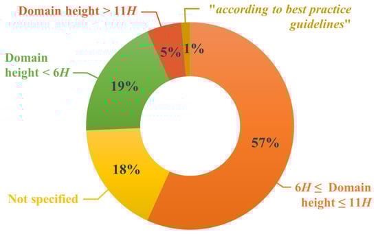 Domain size can highly affect the accuracy of the simulation results. Insufficient offset dimensions from the investigated urban landscape to the domain boundaries can cause significant flow disturbances, leading to non-physical results. On the other hand, too-large domain dimensions can lead to an excessive number of mesh cells and unnecessarily increase the computational resources and time required for the simulations. Therefore, the best option is to achieve a balance between the two. The optimal domain dimensions, represented by their offsets from the investigated building(s) to the domain boundaries, have been a topic in two major projects that produced best practice guidelines in recent decades, [29,30], in some standards [39], and other research [32,46]. The general recommendations related to these research efforts are presented in the following sections.