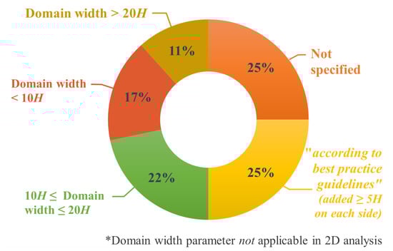 - Information is sorted and filtered, if necessary. For example, the parameter domain width is dependent on another parameter, which is the dimensionality of the model (2D or 3D). The domain width, defined as the distance between the built area and the lateral boundaries of the domain (not in the flow direction), does not exist in a two-dimensional domain. Therefore, papers that utilize 2D modelling need to be filtered and excluded from the analysis of the parameter domain width.