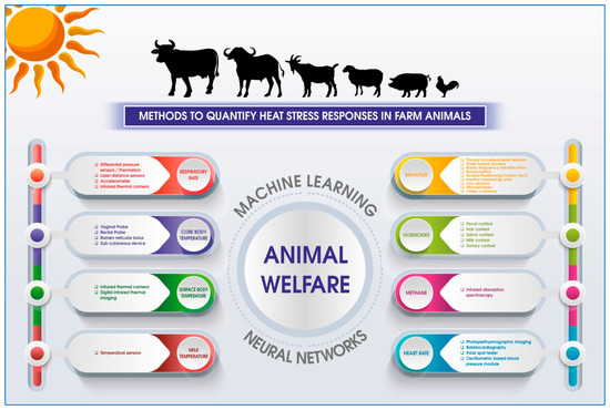 The assessment of heat stress in livestock has advanced to the nest level with the incorporation of automated monitoring systems. These are broadly composed of ‘on-animal sensors’ and ‘off-animal devices’ [30]. These sensors, being of varied types, can record a number of behavioral responses (eating, drinking and rumination activity, resting time, rumination time, and locomotory activity) and physiological responses (respiration rate, heart rate, body temperature, and rumen temperature) [30]. Further, these technologies can also enable automatic, continuous, and real-time heat stress monitoring. Although applications of these advanced technologies in heat-stressed animals, especially in species other than cattle, are limited, they are, however, gaining more reach due to their importance, especially in the current scenario wherein animal welfare is considered of equal importance.