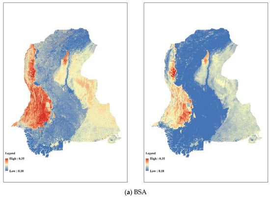 (3) The LSA is obtained based on the data of the typical feature spectral library and the BRDF parameters of GF-1 WFV. The MODIS BRDF model parameter (MCD43A2) products provide seven bands of linear kernel-driven model coefficients, which characterize the directional reflection characteristics of the surface. Using the linear kernel-driven model, model coefficients and equations and coefficients provided by Schaaf, the black-sky albedo and white-sky albedo can be calculated for each band. The calculation formula is shown in Equation (2).