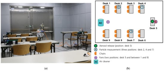 IATC test setup with one aerosol generator, two fans, one air cleaner, and three particle measurement devices: (a) view towards aerosol generator; (b) positions of the aerosol generator, three particle counters, and the air cleaner (AC) in the test room.