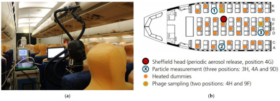 Aircraft cabin and positions: (a) interior view; (b) positions of the Sheffield head, three particle counters, two air samplers for phage plaque assay, and 25 heated dummies.