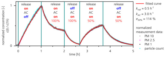 where fn(t) is the normalized concentration [-] at a certain time t in [h] during phase n, N is a normalization parameter [h−1], kn is the total loss coefficient in [h−1] in phase n, knat is the natural loss coefficient in [h−1] determined in phase 1, t0 is the time in [h] at the beginning of the aerosol release, t1 is the time in [h] at the beginning of the simultaneous operation of aerosol release and air cleaner, tn−1 is the time in [h] at the beginning of phase n, fn−1 is the normalized concentration [-] at the end of the previous phase n−1 at tn−1, and rn is a parameter that characterizes the status of the source: r = 0 means off and r = 1 means on.