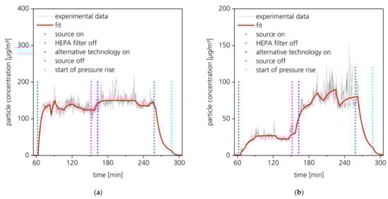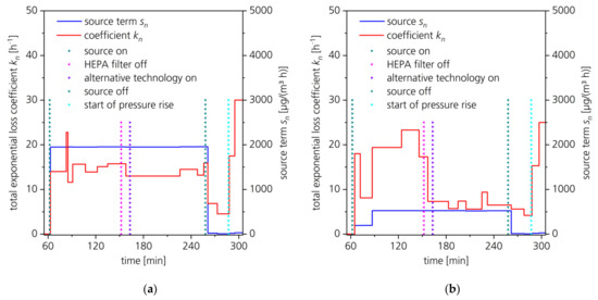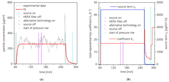 The removal effectiveness of an air cleaner can be specified in a laboratory under controlled and reproducible conditions. Mathematical models can implement the analysis of the experimental data of the test. Without a source that releases matter in the analyzed phase of the experiment, a simple exponential decay function can be used for the analysis [2,4,5,6]. While matter is released or contaminated outdoor air is infiltrating the room, a source term has to be considered [11,12,13,14,15]. Models based on a source term and a first-order loss term are common and well described elsewhere [3,8,10,11,12,14,15,16,17,18].