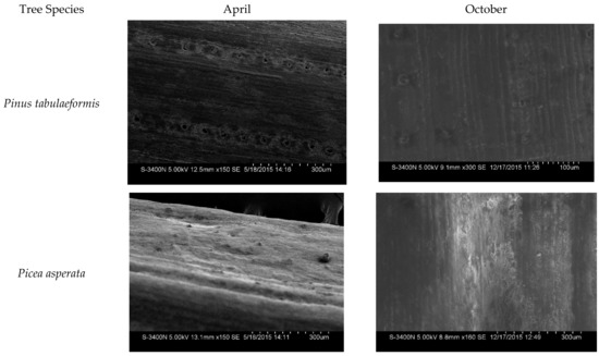 Four representative tree species (the coniferous and broad-leaved tree species with the highest and the lowest dust-retention capacity) were selected from the 10 tree samples: P. tabulaeformis, P. asperata, S. babylonica, and G. biloba. The leaf surface characteristics of different tree species at different times in April and October were described. The month of April was when the experiment began and it was the time of the early stage of tree growth. October was the last sampling month in this study, which was also the end stage of the growth of trees. A significant difference was found in leaf morphology in this period. Figure 3 shows that a large number of stomata were found on the leaves of P. tabulaeformis and P. asperata in April, and stomata were clearly visible. The leaf surface of P. tabulaeformis and P. asperata was not smooth, with a large number of grooves and bumps. In April, the number of stomata on the leaf surface of S. babylonica and G. biloba was lower than that of P. tabulaeformis and P. asperata. The leaf surface of G. biloba was very smooth, and the stomata distribution could hardly be seen. In October, a large number of particulate matter was present on the leaf surface of the four tree species, and the leaves were rougher. The number of particulate matter on the leaf surface of P. tabulaeformis and P. asperata was significantly higher than that of S. babylonica and G. biloba. The leaf surface roughness of S. babylonica and G. biloba was also greater than that in April, and the stomata were full of particulate matter. The leaves of coniferous trees were rougher, while the leaves of broad-leaved trees were smoother.