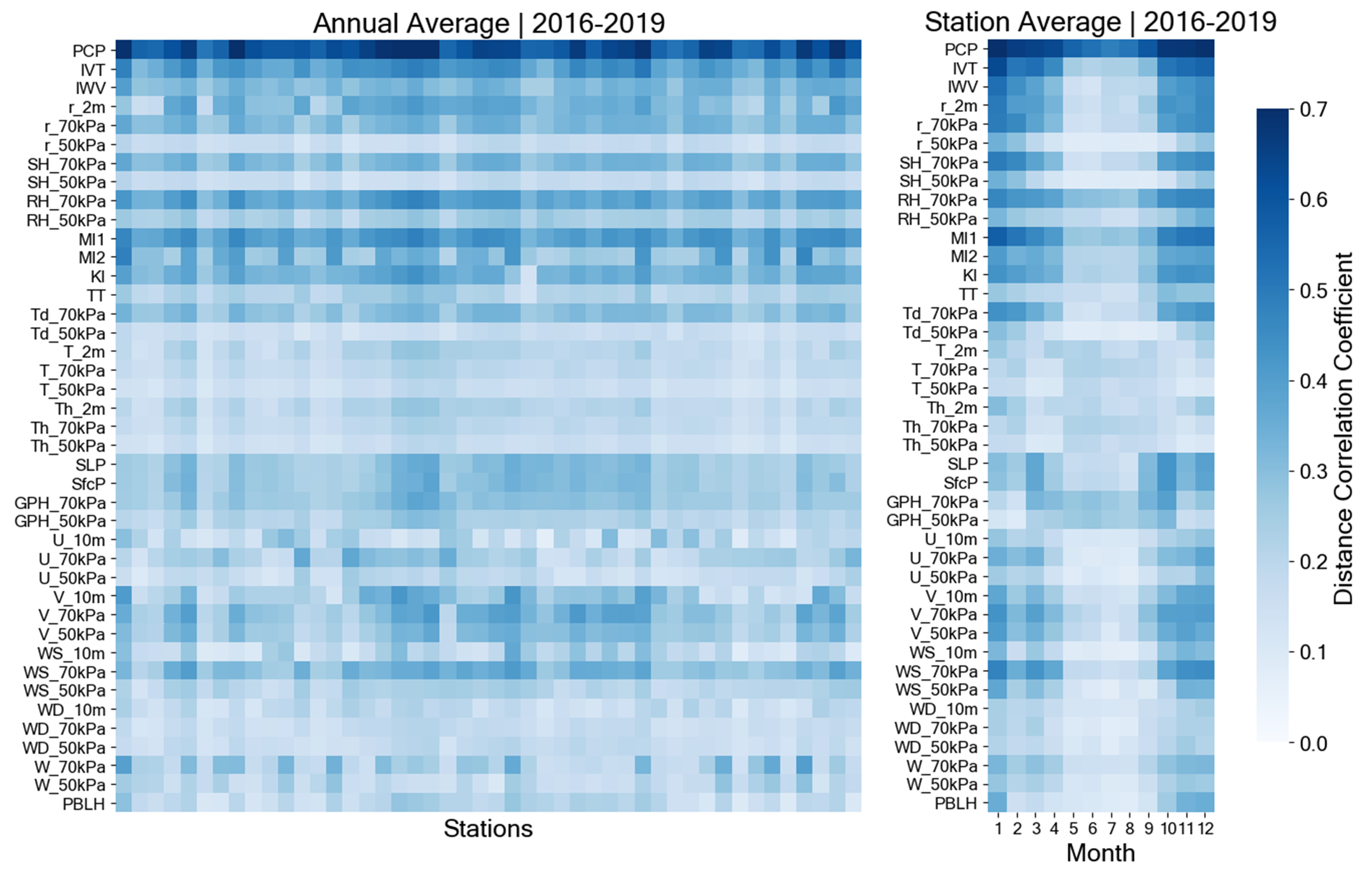 - DCV-EFS: Using the EFS to test a subset of 10 variables as predictors, except here, the predictor candidates are based on the best DCorr, as well as the variance inflation factor (VIF, a measure of multicollinearity among variables). Specifically, we grow a set of 10 predictor candidates by sequentially adding one variable at a time, starting from the best ranking DCorr, provided the VIF among the growing set of predictor candidates stays below a threshold value of 10. If this threshold is exceeded it means that the variable exhibits strong correlation with other variables that were already selected and we assume that this variable contributes no additional value as a predictor for the AnEn. Since some of our 41 variables are related (e.g., the same variables at different vertical levels), the VIF check limits the use of correlated and presumably redundant variables in the FS.