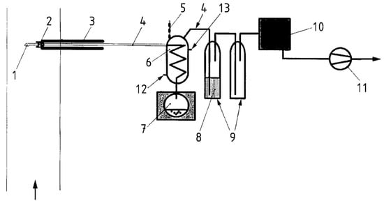 Diagram of the emission sampling line. 1. Nozzle; 2. Thimble filter; 3. Heated probe; 4. Glass connections; 5. Temperature control; 6. Condenser; 7. Condensate flask; 8. Diethylene glycol; 9. Solid adsorbent; 10. Drying tower; 11. Suction device; 12. Cooled water inlet; 13. Cooled water outlet.