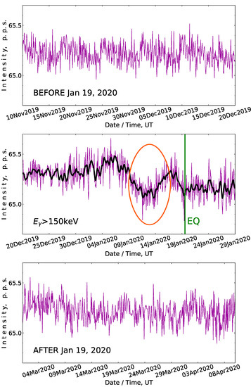 The smoothed distribution, which appears after the application of such an averaging and filtering procedure, is shown, piecewise, in the plots of Figure 3. As before, the values of the radiation intensity in this figure are expressed in the p.p.s. units, and only the data which correspond to the second amplitude channel with the energy threshold of detected gamma ray quanta of 150 keV are considered here. The time distribution that results from the averaging of the original data is shown by the thin line in all three graphs, while the result of the additionally applied filtering is shown by the thick black curve in the middle panel only. Among the three plot frames in Figure 3, the upper one corresponds to the time period significantly preceding the moment of the 19 January 2020 earthquake, the middle one overlaps this moment, and the data acquired much later than the earthquake are reproduced in the bottom plot. Each plot in the figure covers a prolonged time lapse of the order of a few weeks.