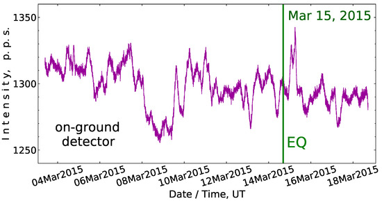 Figure 2 demonstrates a sample of typical monitoring data of the intensity of gamma radiation as measured at the Tien Shan station by the detectors installed at the surface of the ground and at the depth of 40 m in the borehole. As is explained in Section 2, the monitoring of the intensity of gamma ray signals in both detectors was done with 10 s periodicity and for a number of energy thresholds of registered gamma ray quanta. The data plotted in Figure 2 relate to the range with the minimum energy threshold of registered gamma rays, 30 keV, and all intensity values there are expressed in the units of the counting rate, i.e., they are normalized to the amount of the pulse signals, which come per one second (p.p.s.) in a given energy range of the corresponding detector.