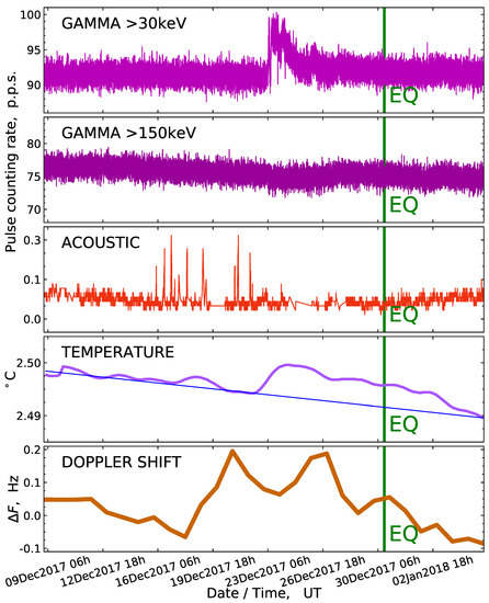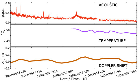 In Figure 9, the time history of the intensity of acoustic pulses and temperature in the borehole, as well as of the Doppler shift values, is represented over a 3 weeks long time lapse before the 30 December 2017 earthquake. (The temperature measurement in the borehole was started only on 1 December, so the plot in the corresponding panel of this figure is not complete). It is seen that outside the 10 days period that immediately preceded the earthquake, neither any anomaly of the quasi-regular kind in the ACOUSTIC time series nor a significant deviation in the temperature and Doppler shift values from their usual uniform trends were detected. This observation confirms the connection fidelity of the anomalies plotted in Figure 5 with the seismogenic processes that were going on in the pre-earthquake time.