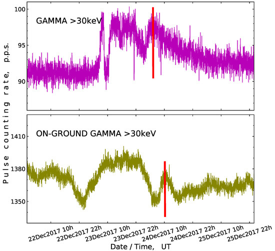 Smoothed records of signal intensity in the gamma detectors written before (upper panel) and after (lower panel) the rise of soft radiation on 23–24 December 2017.