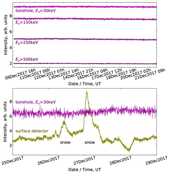 In Figure 7, the records of signal intensity in gamma detectors are shown, which were written in the two time periods immediately before and after the burst of soft radiation on 23–24 December 2017. The time distributions presented here were previously smoothed in accordance with the procedure described in Section 3.2. In the upper panel of Figure 7, it is seen that before the outburst, the radiation background in the borehole remained undisturbed. As follows from the plot in the bottom panel, it was not influenced even in the periods of two intensive snowfalls, which occurred on 26 and 27 December and left their imprints in the data of the surface detector. These data confirm the reliability of the soft radiation increase in subsoil layers that was detected in the low-threshold channel of the borehole detector around the earthquake time.